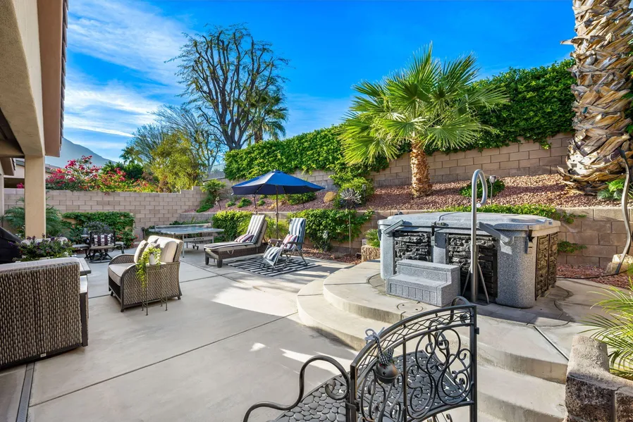 Welcome to the coveted Trilogy La Quinta-an exclusive 55+ resort-style enclave cradled by breathtaking mountain vistas! This highly sought-after Monterey plan, with new aboveground Spa and charming Tuscan facade offers 2 bedrooms, 2 baths, a versatile den/office (easily a 3rd bedroom with stylish barn doors), and 1,693 sq ft of open-concept elegance. Bask in the natural light of the great room, featuring custom window treatments, recessed lighting, tile flooring, and a sleek media niche. The entertainer's kitchen dazzles with stainless steel appliances, slab countertops, gas cooktop, double built-in ovens, microwave, a generous prep island with bar seating, and a walk-in pantry. Guests will appreciate the comfort, and privacy afforded them, and the primary suite is a serene escape with plank flooring, a bay window, and spa-like en suite complete with dual vanities, expansive shower, and ...