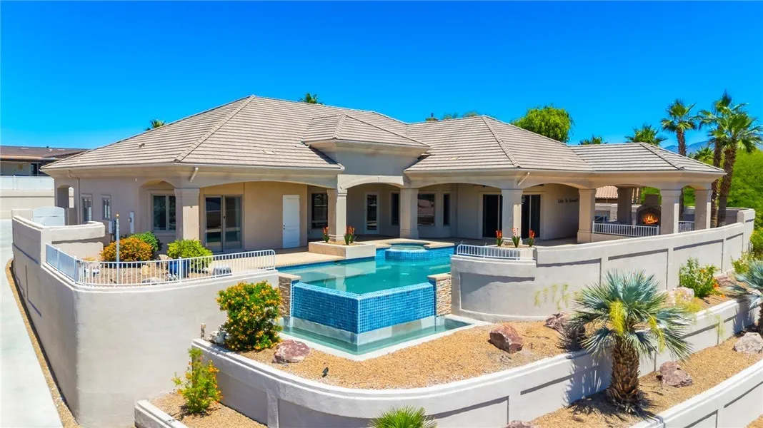 Exciting! Luxurious! It is stunning!! Single level home; plenty of parking. Dramatic 16 ceiling in huge entry room with cozy fireplace. Open concept living, luxury finishes,soaring ceilings,space throughout. The highlight! Do you see the Vanishing Wall? Shut it when hot or bring the outdoors inside,double your entertaining space. Huge kitchen (home on natural gas) with island/bar. Indoor/outdoor dining, lots of room for your favorite furniture and artwork! Lake and golf course views,even Havasu s famous Cupcake Mountain! Elevated infinity-edge pool set against breathtaking sunset views. Meticulous desert-landscaping, complemented by charming gazebo, built-in BBQ and large covered patio. Sprawling primary suite offers complete privacy! 2 guest rooms with en suite bathrooms, walk-in closets. Attached two car epoxied garage connects main house to Guest House. Guest Wing very versatile space...