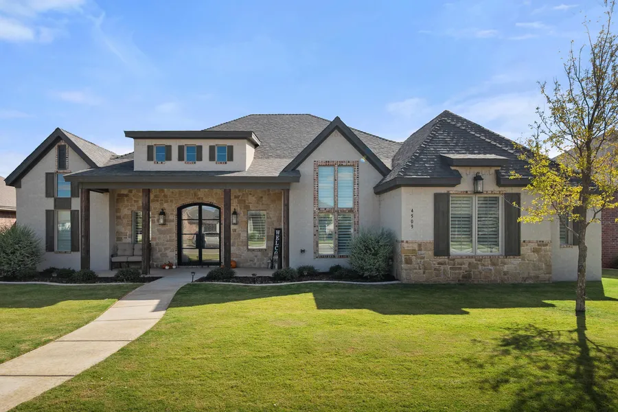 Welcome to Stratford Pointe's premier Southern Home by Dan Wilson! This stunning four-bedroom, three-bathroom residence with a bonus room is a showpiece of timeless design and exceptional craftsmanship. From the moment you arrive, the impressive curb appeal captures your attention with its striking combination of brick, stone, stucco-over-brick, and cedar accents, all topped with durable 30-year impact-resistant shingles. Step through the grand double doors into a soaring entryway filled with natural light from triple light fixtures and tall ceilings, immediately setting the stage for effortless elegance. The open-concept living room, highlighted by beautiful beamed ceilings, flows seamlessly into a chef's dream kitchen featuring quartz countertops, a gas cooktop, double ovens, and a working pantry fully equipped with ample storage and a beverage refrigerator, all wrapped in stunning lux...