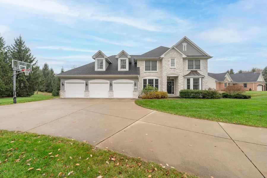 Great home in the highly desirable Barrington Shores community: custom-built, two-story walkout home that is ideal for entertaining. This property is light, bright, and features a recently remodeled chef's kitchen with new stainless steel appliances, including a gas cooktop and stainless hood vent, all set against beautiful quartz countertops and a four-person center island. The home boasts an open great room with 20-foot ceilings, new carpet, and a gas log fireplace. This space connects to a vaulted, all-seasons sunroom that leads to an enclosed, second-story composite deck. The main floor features a private primary suite, separated by architectural columns from a sitting area. The primary bath has been beautifully remodeled and includes a gorgeous two-person tiled shower and a large walk-in closet with custom organization. Upstairs, you will find three additional bedrooms, each with its own private bath and excellent closet space. The finished lower level is a walkout with ample daylight, custom built-ins, a large bar, and a private guest suite. It also includes a huge storage area with additional finishing potential, plus an attached shed for external storage. Key features and upgrades include a Generac whole-house generator, Kinetico water softener, Bradford-Smith water heater, and a new roof. The property benefits from Texas Township taxes and Mattawan schools, and the Barrington Shores association provides amenities such as tennis courts, a pool, a clubhouse, walking trails, and a sledding hill.