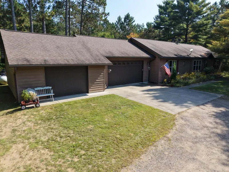 Year around home in a private setting. 3-bedroom, 2-bath with vaulted living room ceiling and gas fireplace. Three solar tube skylights bring natural light into darker areas. Attached 2-car garage with an additional garage/workspace. The unfinished basement had extra wall insulation and has a tall ceiling, giving it a spacious feel. The 5.4 acre lot is wooded with trails, and a fenced area for a garden or your furry friends. This great location has access to all the Northwoods lakes and recreation opportunities!