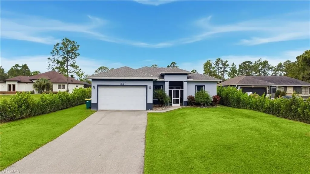 Offering exceptional value, this well-maintained estate home delivers comfort with a bright, coastal-inspired feel. Featuring 3 bedrooms and 2 baths, the residence offers an open floor plan ideal for everyday living and entertaining. Natural light enhances the living and dining areas, while a breakfast nook adds warmth and functionality. The modern kitchen is appointed with stainless steel appliances, wood cabinetry, and quartz countertops, complemented by matching quartz finishes in the bathrooms. Details such as crown moulding, a washer and dryer, and a full sprinkler system elevate the home's quality and ease of living. Outside, a large, covered terrace is perfect for relaxing and enjoying serene front and rear views. The property is beautifully enhanced by tropical landscaping, Calusa-lined hedges, a mostly cleared lot, and a paved driveway leading to the 2-car garage, offering privacy and curb appeal. Set on a spacious 1.14-acre, 100% upland lot, this home is ideally located just minutes from a new grocery store and nearby amenities, within a rapidly growing area surrounded by new construction and development. Listed below appraised value, this is a rare opportunity.