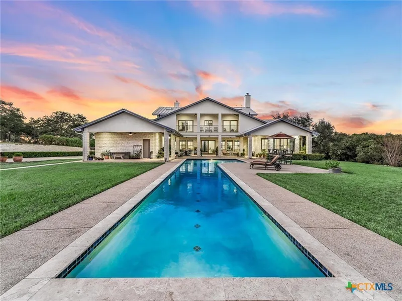 Welcome to this beautiful, 4-bedroom, 4-bathroom home in the sought-after River Chase neighborhood of New Braunfels, offering a peaceful, relaxed lifestyle. This 4,900+ sq ft residence features oversized rooms, most that have been remodeled with new paint, countertops, flooring, custom blinds, drapes, including front iron doors. The property spans over 2 fully fenced and gated acres at the end of a quiet cul-de-sac, providing privacy and a picturesque setting that includes a salt water gunite lap pool and custom built, landscaped fountain. This exceptional home was built with efficiency, quality and security in mind, featuring 5/8" drywall, insulated interior walls, 2 foam insulated walk-in attic spaces, custom Elfa shelving, pantry and utility room, Pella doors and windows, 2 tankless water heaters, and a metal roof. The security system includes exterior cameras and motion sensor lights, door sensors, and indoor motion detectors. Other features include a water softener, pre-wired speakers indoor & outdoor, 2 fireplaces, indoor utility room for extra storage, seasonal clothing, etc., and an extended 3rd garage door bay for oversized vehicles. The upstairs kitchenette provides flexibility for a mother-in-law suite, exercise room, game room or media room. The upstairs patio has 2 outdoor storage rooms. Additional exterior features include a sprinkler system, fire pit, walking path, and a gas line and electrical access for an outdoor kitchen. The primary HVAC unit and pool pump have recently been replaced. Most furniture is available for sale. Exclusive resident amenities include 2 community parks, club house, swimming pool, fitness center, hiking trails, sports courts/fields, and access to the Guadalupe River. Don't miss your chance to own a piece of the Hill Country in the heart of River Chase!