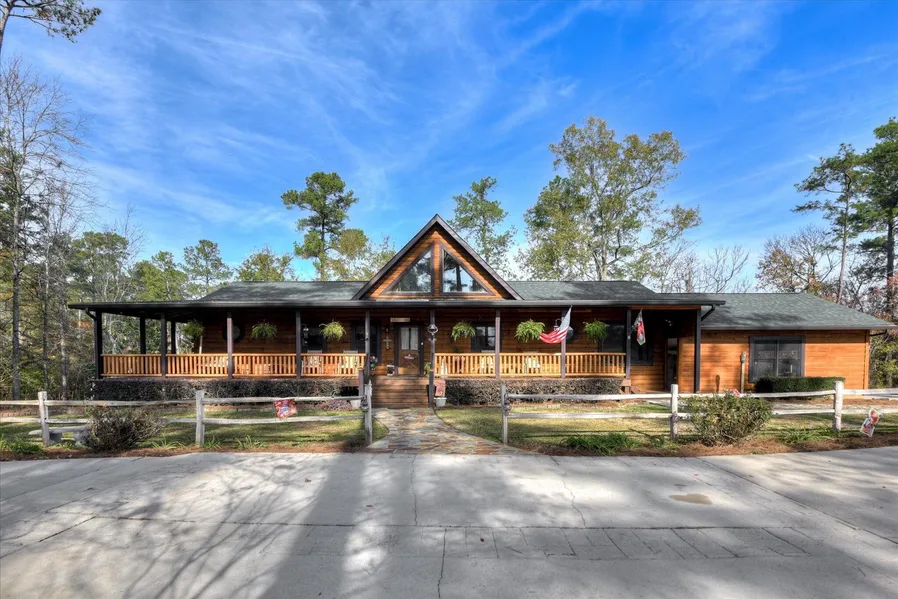 Experience the timeless beauty and craftsmanship of this exceptional custom log home, offering over 3700 square feet of finished living space with approx. 450 sq ft of partially finished storage space/ flex space. Nestled on two private, wooded acres with beautiful stone walkways, this residence welcomes you with a grand wraparound porch, and two-tiered decking perfect for outdoor entertaining, with a spacious detached workshop. Ideally located in North Augusta, just minutes from both Aiken and Augusta, this property combines rustic charm with modern convenience. Constructed from solid white pine logs, the home features impressive property-sourced wood beams and locally reclaimed brick tiles in the kitchen, creating a unique blend of natural textures. The gourmet country kitchen showcases custom hickory cabinetry, sleek black granite countertops, and enduring quality. Throughout the home...