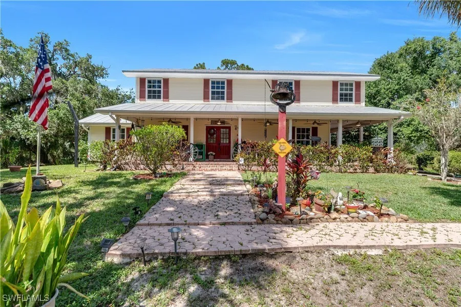 Beautiful 4.5 +/- acre property on Daughtreys Creek is now available on Slater Rd. This property has it all including a solid, concrete poured home with 5 additional out-buildings, all with metal roofs. The property has a beautiful, 2 story home with a huge, covered wraparound porch perfect for morning coffee or cooling down with an afternoon iced tea. The great room, 21' at its peak, is large with wood flooring and has a cozy gas fireplace framed by a tiger oak, antique mantle from Kentucky. The french doors leading out to the new, open back porch allow for tons of light making this home bright and cheery. The kitchen has a newer range, microwave and disposal plus beautiful granite countertops, an enamel sink with new fixtures and a generous sized pantry. The laundry room is huge with ample storage and includes a laundry sink plus a high-end washer/dryer set. Two bedrooms and a full bath, with a steel enameled tub, are on the first floor, with a huge master bedroom loft upstairs. The master bath includes a jetted, two-person jacuzzi brand tub and an extra large walk in shower. The separate 5 out-buildings consist of: 1. A 40 x 8 Mobile Mini with double doors on both ends and a vented, peaked roof. 2. A detached, insulated single car garage with an electric, overhead automatic door, plus a side door for entry. It sits on a poured concete slab and has both water and electric. 3. An open pole barn with electric is perfect for storing your RV and it is equipped with high intensity motion lights. 4. A 16 x 24 two story height Tuff Shed, with windows, is currently being used as a workshop. It has heavy-duty double doors on both ends and sits atop a 20x40 concrete slab with 12" footers. Water and electric are available. 5. A 10 x 12 Ted Shed adds for extra storage or a workshop. This entire property has tons of security lighting throughout and is fully fenced with multiple interior gates to cordon off individual pastures. The property backs up to Daughtreys Creek and contains a separate small pond. This home was designed and custom built by Malachi Construction. All of the details, from the trusses to the wiring and everything in between was done with care and consideration. An added plus, the property has all underground utilities AND the home has an installed Starlink System. Fun facts: The property sits, in part, what was once the Slater Saw Mill that was in operation from the 1920's to the mid 40's. And, the brick facade on the home was harvested from the original Ft. Myers High School when it was downtown before being moved to Cortez Ave. Be sure to see the attached video for a home tour.