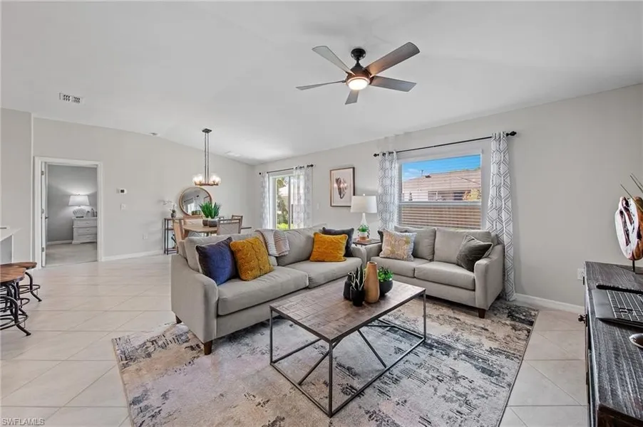 Former Furnished Model - 3BR/2BA Dover Plan in Crane Landing | 1,551 Sq. Ft. Why wait to build when you can move right into this beautifully upgraded, former furnished model home in Crane Landing, a master-planned community in North Fort Myers? This stunning Lennar Dover plan offers 3 bedrooms, 2 bathrooms, and 1,551 square feet of thoughtfully designed living space-all professionally decorated and fully furnished. The open-concept layout features a bright and welcoming kitchen with center island, seamlessly flowing into the dining area and family room-perfect for both daily living and entertaining. Sliding glass doors lead to a private outdoor patio, ideal for relaxing and enjoying the Florida lifestyle. The spacious owner's suite offers a large walk-in closet and a private en-suite bath, while two well-placed secondary bedrooms ensure privacy and flexibility for guests, family, or a home office setup. As a former model, this home is loaded with designer upgrades and tasteful furnishings throughout-truly move-in ready. Crane Landing residents enjoy resort-style amenities, including basketball, pickleball, and tennis courts, a soccer field, and a playground. Conveniently located near Downtown Fort Myers, Cape Coral, and Fort Myers Beach, this home offers easy access to dining, shopping, and entertainment while still providing a peaceful, suburban setting. Don't miss your chance to own this stylish, turnkey home in one of Southwest Florida's fastest-growing communities!