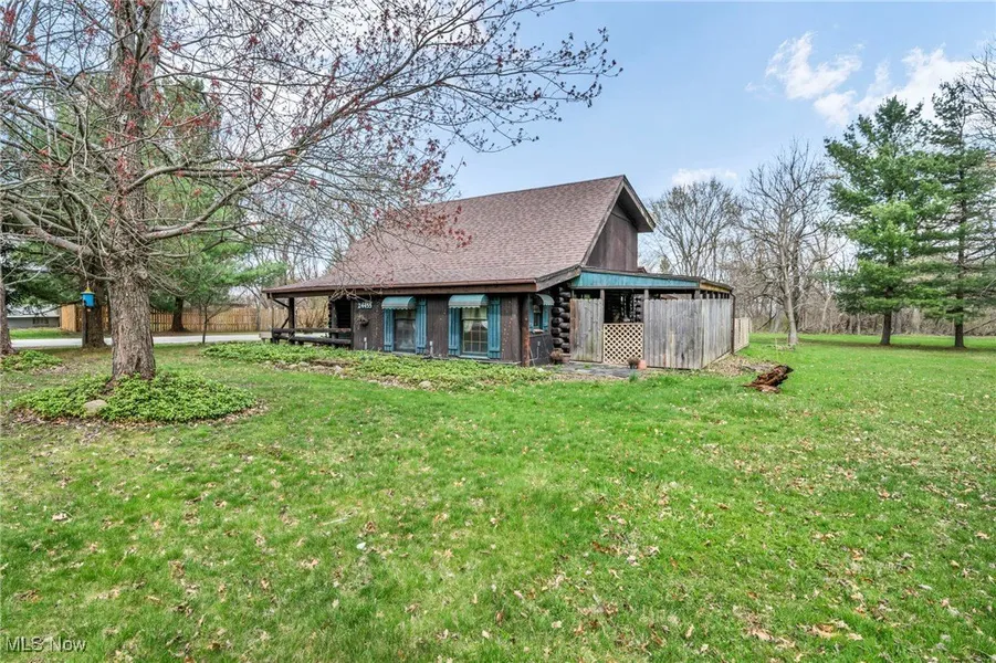 Full 4k Video Available, Rare Opportunity! Discover a one-of-a-kind log cabin nestled on a lightly wooded, country-style lot-right in the heart of Oakwood Village! Offering the perfect blend of rustic charm and modern convenience, this dramatic and beautifully crafted 2-bedroom, 2 full bath custom-built log home is truly something special. The first-floor features a full bath with walk-in shower and a convenient laundry area. Enjoy an open-concept layout with a spacious eat-in kitchen complete with custom tile counters, gas range, pantry, and including a new stove and hood (2024). Soaring ceilings, well lit interior with exposed log beams and rich wood accents create a warm, inviting atmosphere throughout. Step outside to your private covered side patio and unwind in the soothing hot tub (chemicals included), surrounded by a fenced backyard oasis. Situated on a large corner lot, you'll also find an attached garage, additional outbuilding/storage shed, and plenty of green space to enjoy. Recent updates include: updated electrical (2024), new carpeting and flooring (2024), newer garage roof (5 years), new garage door opener, patio fencing (5 years), new roof and gutters over patio (5 months), and a brand-new main roof (Nov 2024). A newer window in the 1st-floor bedroom/office adds even more natural light to this already sun-filled home. Whether you're looking to escape the ordinary or embrace a peaceful lifestyle without leaving city amenities behind, this is a rare chance to own a piece of rustic charm in a convenient, low-traffic neighborhood at an affordable price . Welcome home to your log cabin dream!