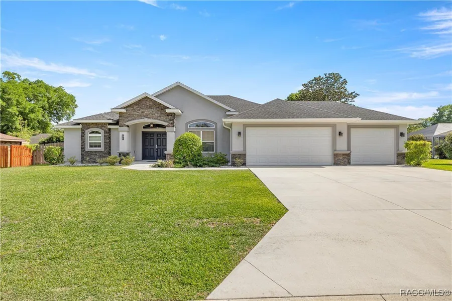 Primary bedroom photos include virtual staging. Welcome to this stunning 2021 custom-built home by Stephens Construction, ideally located in the highly desirable Hunters Trace community. Nestled just minutes from Ocala's scenic greenbelt, Silver Springs State Park, and a short drive to downtown, this location offers the perfect balance of peace and convenience. This thoughtfully designed 3-bedroom, 2-bath home features a flexible office/bonus room and a desirable split floor plan, offering 2,142 sq. ft. of living space and 3,211 sq. ft. under roof. The open-concept layout is ideal for both everyday living and entertaining, with a spacious kitchen that includes a large island, granite countertops, custom built-ins, stainless steel appliances, and abundant cabinetry. The primary suite is a true retreat, complete with tray ceilings, dual walk-in closets, dual sinks, and a dedicated vanity area. Additional highlights include a 3-car garage with a newly epoxied floor, a custom-built shed for extra storage, and a fully fenced backyard offering both privacy and functionality. The exterior shines with stacked stone accents and beautiful curb appeal. Don't miss your chance to own a nearly new, custom-built home in one of Ocala's most sought-after neighborhoods-schedule your private tour today!