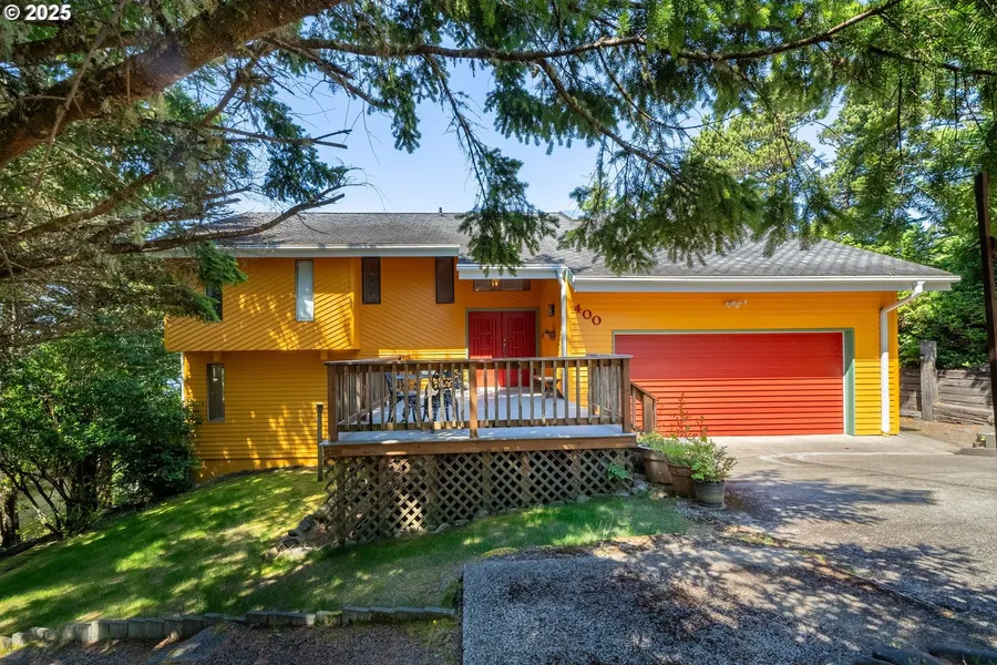 STR LICENSE TRANSFERABLE - HILLTOP OCEANVIEW panorama filtered by beautiful evergreen trees. High above the rooftops and far from tsunami hazard, this vintage 1981 classic features large, well placed windows and wrap-around decking designed to capture all facets of each beautiful coastal day from sunrise to sunset. Living room with vaulted ceiling includes a light bright loft with 3 skylights. Open kitchen with built-ins. Entry level bedroom. Huge family room down with bar and vintage woodburning cookstove. Abundant storage. Be sure to check out the huge area under the house for your future wine cellar.