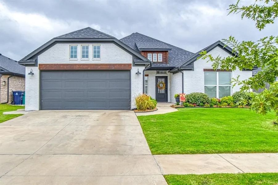 Very well kept, one owner 2022 built home in the Ideal Homes Native Plains community in SWOKC (Moore school district) Light and bright throughout the home - inside and out with energy efficient features to reduce your monthly utility bills. Wood look tile in the main living areas with carpet in the 3 bedrooms complete with ceiling fans. Study/Flex space to the front of the home with built in window seat. The master suite is to the back of the home for privacy with a large walk in closet, tile shower and separate vanities with a garden tub in between. The kitchen features a built in gas range with wall oven and microwave. Quartz countertops, center island with farm sink and counter height barstool seating for three overlooks the living space. White brick surround, gas fireplace as the focal point surrounded by tall windows for maximum natural lighting with custom drapes sure to impress yo...