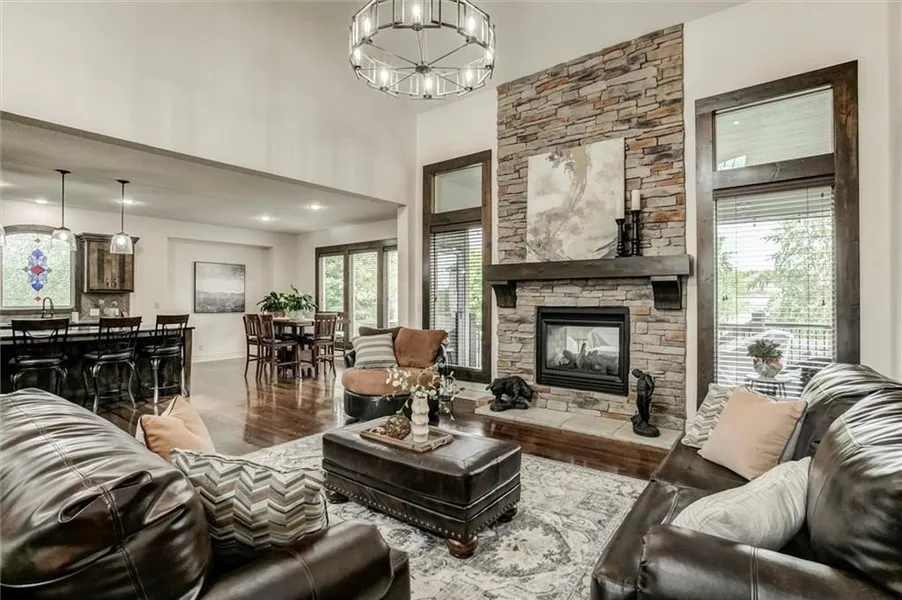 Stunning Don Julian 1.5 Story in a Beautiful Subdivision! This move-in ready home offers space, style, and upgrades-without the wait of new construction. Open floor plan with see-through fireplace to covered deck, large main-floor primary suite with huge closet and connected laundry. Fresh interior paint, new stair carpet, new dishwasher, and a 1-year-old roof! Upstairs features a 2nd primary suite, and 2 more bedrooms. The walkout/walk-up basement boasts a stylish wet bar, 5th bedroom, craft room, exercise room or a non-conforming 6th bedroom and access to a fenced yard with covered porch and patio complete with a fire pit! Enjoy 70 acres of green space with trails connecting to JOCO's trail system-plus Heritage Park's golf, lake, dog park & more nearby. This home has the features new builds miss-at a better value! Choose Blue Valley, Spring Hill or Olathe schools and seek a nonresident transfer!