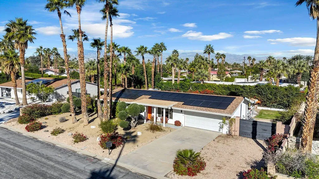 Turnkey furnished and located on fee simple land (you own the land, no lease), this Desert Park Estates home is powered by over 30 owned solar panels and checks all the boxes for full time, seasonal, or investment living in Palm Springs. Located in the iconic Desert Park Estates neighborhood with no HOA, this well maintained 3 bedroom, 2 bath residence reflects true pride of ownership and is ready to move in. Thoughtful upgrades include a newer HVAC and furnace, a modernized pool system with upgraded equipment and lighting, and a finished 2 car garage with laundry. One of the home's standout features is the professionally installed low voltage in ground lighting throughout the front and backyard, creating a warm, inviting presence and exceptional curb appeal. This feature is especially rare and impactful in a neighborhood without streetlights and truly sets the property apart. The private backyard offers beautiful mountain views and a true resort style setting with a pool, above ground spa, full length covered patio, mature palm trees, ficus privacy wall, and gazebo, making it ideal for relaxing or entertaining. Smart home features make it easy to manage and maintain while away, ideal for both full time and seasonal use. Desert Park Estates does allow junior vacation rental permits allowing up to 6 short term rentals per year. Buyer to verify all with the City of Palm Springs. Just minutes from downtown Palm Springs. A rare opportunity to own a beautifully maintained home that truly delivers the classic Palm Springs lifestyle.