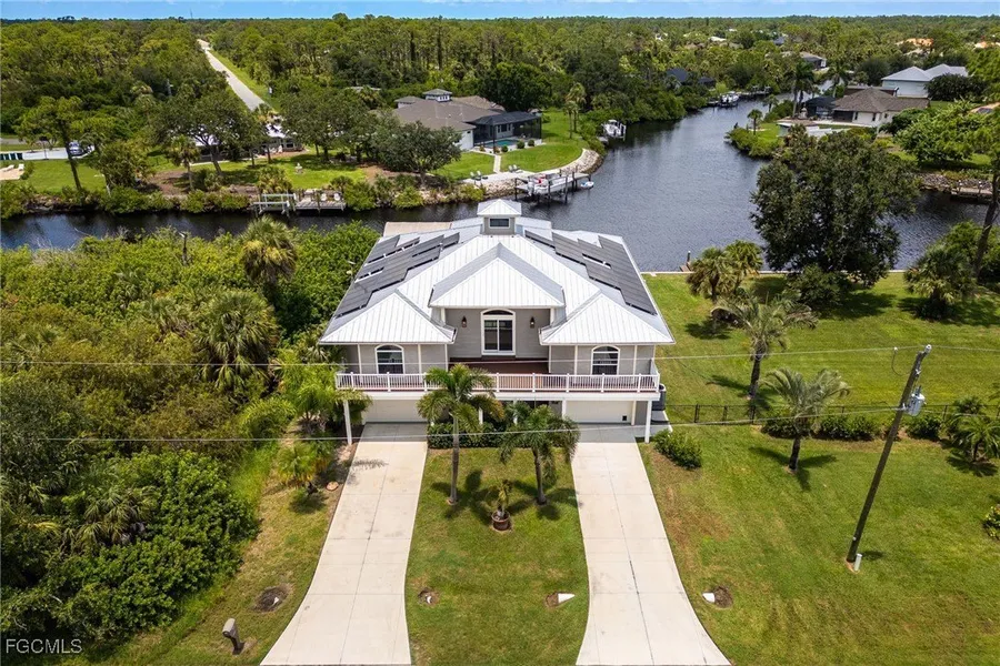 Luxury Waterfront Key West-Style Retreat on nearly 1/2 an acre lot with Gulf Access boating. Experience the ultimate Florida lifestyle in this Solar Powered, remarkable home tucked away on the serene Venus Waterway, just a few minute boat ride to the Myakka River, to Charlotte Harbor and the Gulf of Mexico. Situated on two waterfront lots with 160 feet of concrete seawall, this large masterpiece offers sweeping views of intersecting canals, lush tropical landscaping, and privacy, just minutes from shopping, dining, golf, and beaches. On the first floor you will discover a fully self contained in-law or guest suite with a private entrance, a second full kitchen with granite counters, new cabinets, a bedroom, plus 1.5 baths, a laundry room with storage , and a massive family room. This space is ideal for multi generational living or income potential! Take the gorgeous stairway with bright skylight up to the second floor with vaulted ceilings, new wood flooring, impressive crown molding and plantation shutters framing the expansive open layout. The elegant living and dining rooms are complemented by a gourmet kitchen with sparkling water views. It features granite countertops, wood cabinetry, stainless steel appliances, and an island breakfast bar. Perfect for entertaining while watching dolphins swim by. The upper level also hosts three spacious bedrooms including the primary with a huge ensuite bathroom and walk in closets. Beautiful French doors invite you onto 2 separate second level decks to enjoy the views of wildlife and water. Outside is your personal paradise with an open lanai around the tropical pool and outdoor shower, two private docks with composite decking, one with a 10,000 lb covered boat lift and the other for fishing. A lush landscaped oasis with an oversized, fenced yard giving lots of room to run and play. Additional upgrades include 2022 Roof, 2020 HVAC, New tile flooring, new wood flooring, some hurricane impact windows, shutters for the rest, Ready to use, fully installed Starlink internet. 2 separate garages with storage and outdoor access, and a bonus Tesla charger. Solar powered home (completely paid off) to save you money on energy! This home is special, very peaceful and offers Boating, fishing, sun bathing, relaxing and could be money making! Don't miss this unique opportunity.