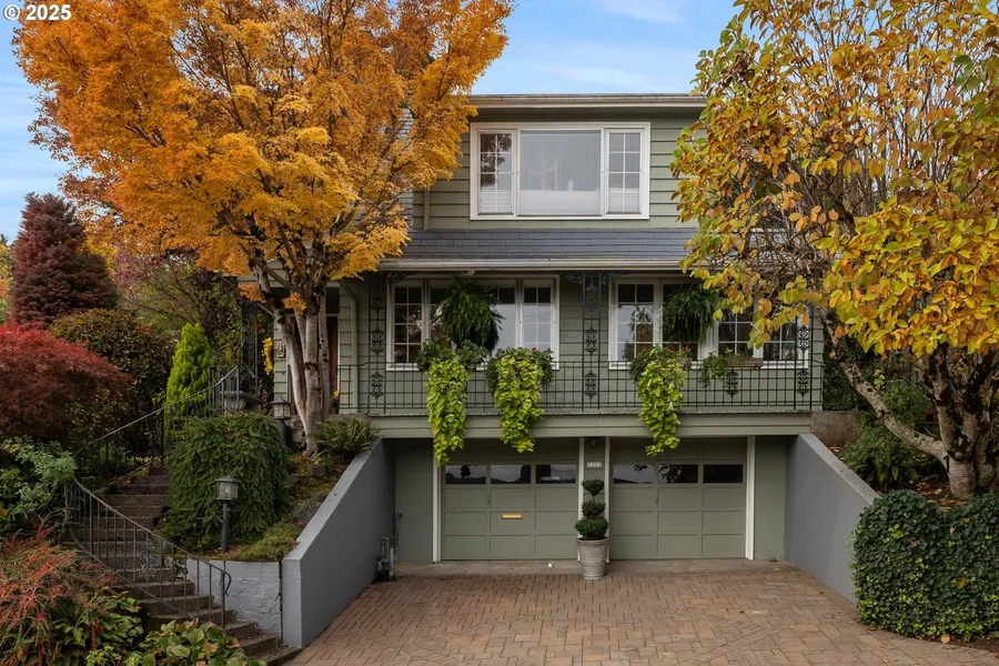 Striking a lofty perch, this Elegant 1927 New England Cape Cod offers spectacular views of the Willamette, Mt. Hood, and Mt. St. Helens. An eastern panorama captures a true highlight reel of Portland core's natural bounty rivaling any penthouse. Begin the day with sunrise ascending behind Mt. Hood, light dancing across the water as it captures sailboats gliding along the river, everywhere a painting comes to life. Step inside a graceful yet also highly functional floor plan, where the home's character unfurls through its formal living room, showcasing intact moldings and hardwood floors, wood-framed windows, and a charming brick fireplace that anchors the home. As you continue into the dining room and turn toward the modernized, upgraded kitchen, the view follows you all the way to the delightful inglenook overlooking the backyard greenery. The original switchback staircase neatly conceals a convenient half-bath just off the kitchen, also easily reached through the living room by visitors. Upstairs, a generous full bath is backlit by Art Nouveau era stained glass and offers a walk-in, tiled shower+clawfoot tub; it's flanked by two inn-like bedrooms that conjure the historic, divinely simple homes of coastal Massachusetts. Set along the quiet, winding and beautiful LaView Drive in Johns Landing, the home is ensconced by a lush, terraced garden straight from White Lotus, lovingly tended over several decades by a Royal Rosarian, whose care and artistry bring the landscape to life with vibrant color and seasonal textures. Follow its path as it slowly snakes up to a view over the home, and concludes in a flat cobblestone landing with private seating. Or go linger on the front deck, and walk across to the north side patio, and fire up the grill as twilight approaches and the boats gradually disappear. Notable recent upgrades include a new electrical panel, central air and new natural gas piping installed, fresh paint throughout and metal roof & gutter maintenance. [Home Energy Score = 4. HES Report