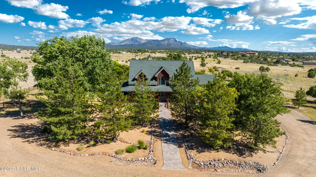 Exceptional 36+ acre equestrian estate in Arizona's high desert! This remarkable property showcases a custom log home with sweeping 360 mountain views, refined rustic style, and thoughtful modern enhancements. Designed for comfort, it offers single-level living with a guest suite and third bedroom upstairs. Built with rare double split log walls and traditional saddle-notch joinery, the home blends timeless craftsmanship with enduring strength. Inside, highlights include dramatic vaulted ceilings, a striking river rock fireplace, a chef's kitchen with Viking and Sub-Zero appliances, and a luxurious primary suite. Recent improvements add peace of mind and convenience: fresh exterior stain, Rain Bird irrigation, a full-house Generac generator, new fencing, and an expansive paver patio ideal for soaking in glowing sunsets. Equestrian amenities are extensive with a 3-stall barn, round pen, tack room, wash racks, automatic waterers, mare motel, and an 864 SF guest bunkhouse. Direct trail access connects you to thousands of acres of Prescott National Forest for endless riding adventures. Additional property features include apple, peach, and pear trees, a strong well, a 5,000-gallon storage tank, and zoned HVAC. An adjoining 36 acres is available, creating the rare opportunity to own a 72+ acre equestrian estate in a setting that delivers privacy, adventure, and a true high-desert retreat.