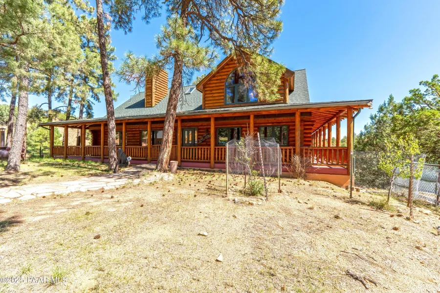 Experience timeless mountain living in this extraordinary custom log home, perfectly perched on over 5.4 private acres with breathtaking 100-mile views of the San Francisco Peaks and beyond. Nestled against the Prescott National Forest, this one-of-a-kind property offers unparalleled privacy, direct trail access, and luxury craftsmanship at every turn. Step through an artistic gated entry, adorned with impressive wildlife sculptures, and enter a world where rustic charm meets refined elegance. Built with classic post and beam construction, the home features cathedral ceilings in the great room, exposed beams, and tongue-and-groove pine-clad ceilings that highlight the home's warm, natural beauty. The heart of the home is a chef's dream kitchen, fully equipped with a 6-burner Thermador range with double convection ovens, a built-in refrigerator with custom wood panel fronts, Bosch dishwasher, and a massive granite island ideal for meal prep and entertaining. Whether you're hosting guests or enjoying a quiet evening, the expansive dining area surrounded by windows brings the outdoors in with stunning natural light and views. The owner's suite is a true retreat, featuring an ensuite walk-in closet and a luxuriously appointed bathroom. Two additional guest bedrooms and a full guest bath provide comfort and space for family or visitors. A versatile loft area with a 3/4 bathroom offers endless possibilities--from a media room to a home office or additional sleeping quarters. Enjoy year-round outdoor living on the expansive wraparound cedar porch, perfect for relaxing with a morning coffee or entertaining with sunset views. Car enthusiasts and adventurers alike will love the massive 6-car garage/RV barn, complete with RV hookups, plumbing for heat, and ample room for toys, tools, and gear. The rear of the property features flat, usable land with a 4-stall mare motel, ideal for horse lovers and equestrians. With direct access to the national forest, saddle up and ride out onto miles of scenic trails right from your backyard.