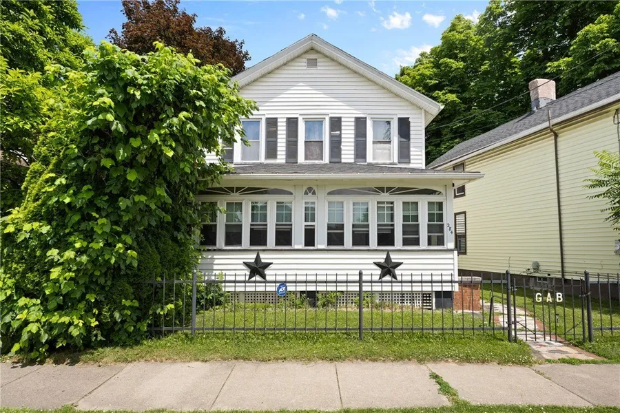 This listing includes 2 lots! 1st lot includes large, well maintained house! The wrought iron fence in the front leads to long driveway leading back to 2nd lot with 1044 sq ft garage which is also accessible from Hall Alley. This 4 bedroom house sits on a fenced lot and has a large enclosed front porch. French doors lead from foyer to the living and dining rooms. Large kitchen has enough room for an eating area or island. Laundry and mud room has 1/2 bath and access to rear yard and basement. 1 bedroom has a walk-in closet and another has 2 closets. Hardwood floors and gumwood trim, Water heater 8 yrs, furnace 12 yrs, glass block windows in basement. The garage has a workshop and storage room, engine pull and wood stove for year round use. House is rented to long term tenants who desire to stay.