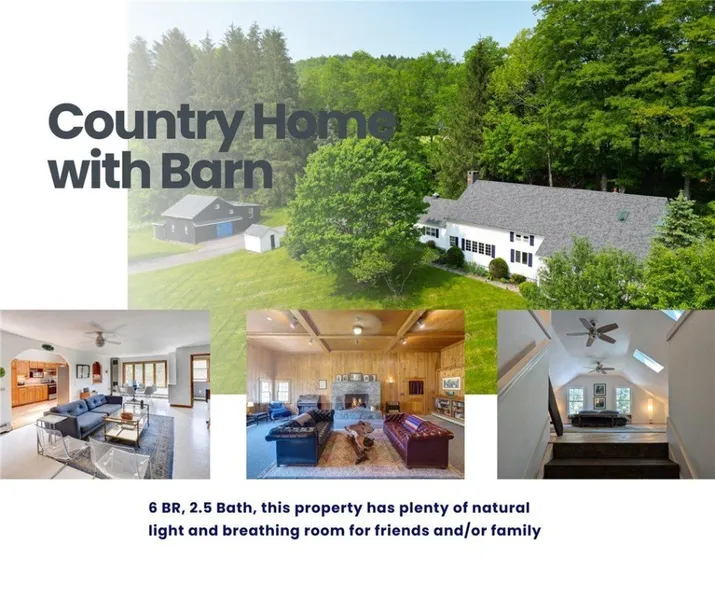 Country Home with Barn - Space to Live, Create, and Earn. This expansive 6-bedroom, 2.5-bath home offers exceptional space and flexibility for living, entertaining, or generating income. The stunning great room features soaring ceilings with custom woodwork and a striking 6-foot-wide bluestone fireplace, a centerpiece that brings warmth, charm, and rustic elegance. The heart of the home is a well-equipped kitchen with ample counter space, generous cabinetry, and room to cook for a crowd. Just off the kitchen, you'll find a dedicated dining area, a cozy living/TV room for movie nights or casual lounging, and a sunroom filled with natural light, perfect for relaxing, reading, or enjoying a morning coffee. Upstairs, a large converted attic now serves as a spacious bedroom with character and privacy, while the full basement provides even more room for recreation, work, or storage. Out back, ...