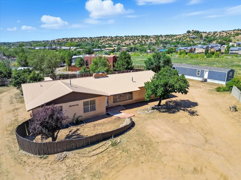 Exceptional opportunity on 3/4 acre, backing to open land with the Santa Fe River just beyond. This unique property offers a main residence, a private studio apartment, and a manufactured home-ideal for guest quarters, multi-generational living, or income potential. The main house is adobe and has original hardwood floors throughout (under the carpet), a wood burning double-sided fireplace, four bedrooms and two bathrooms. The studio has a large living space, kitchen and full bathroom. The 2019 manufactured home includes two bedrooms, two bathrooms and refrigerated air. Enjoy privacy, space and mountain views, just 3 miles from the Santa Fe plaza and near trails, shopping, dining, parks, and schools.