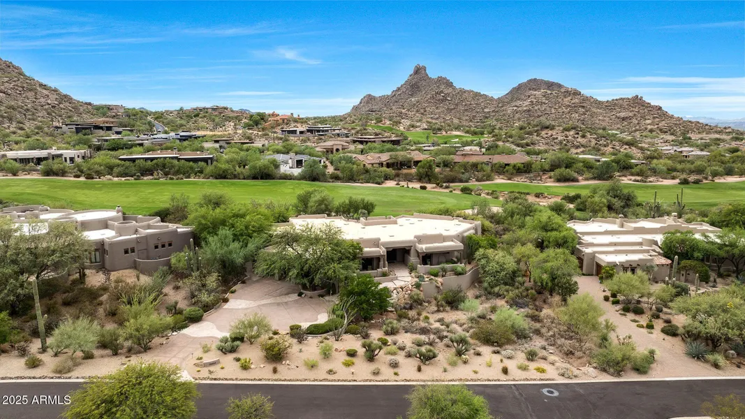 Positioned on a premier golf course lot in guard-gated Pinnacle Canyon at Troon North, this extensively remodeled MI Homes residence was completed in 2022 and offers 4,547 square feet of refined living with four bedrooms plus an office, four and a half baths, and a three-car temperature-controlled garage with a Tesla charger. The home is being offered completely turnkey, with most furniture and accessories included. Inside, the popular split floor plan showcases wood-like tile flooring and a striking kitchen with new cabinetry, counters, and stainless steel appliances, including a gas cooktop, side by side Subzero Fridge/Freezer, drawer microwave, dishwasher, ice maker and double wall ovens. Adjacent to the kitchen is a built-in wine cooler storage and a wet bar with sink and beverage fridge. The spacious great room is anchored by a modern floor-to-ceiling fireplace and retractable sliders that seamlessly open to the outdoors. Outdoor living is unmatched with an elevated-tier backyard featuring a resort-style pool with waterfalls and boulder accents, spa, built-in barbecue, fire pit and large covered patio, all capturing golf course and direct Pinnacle Peak mountain views. The primary suite is a private retreat with a spa-like bath featuring a freestanding tub, dual vanities, and walk-in shower. All guest bedrooms are ensuite and enjoy private entrances with covered patios, creating the perfect setup for family or visitors. The private office with exterior access has a box beam ceiling, built-in cabinets and floating shelves. Additional highlights include a large laundry with sink and a granite key drop with cabinetry off the garage entry. Extensive updates enhance peace of mind: exterior painted (2025), three HVAC units (2020), water heater and water softener (2025), pool pumps (2023 & 2025), pool lighting (2023), epoxy garage floors and cabinets (2024), garage doors (2021), and sound system (2020).