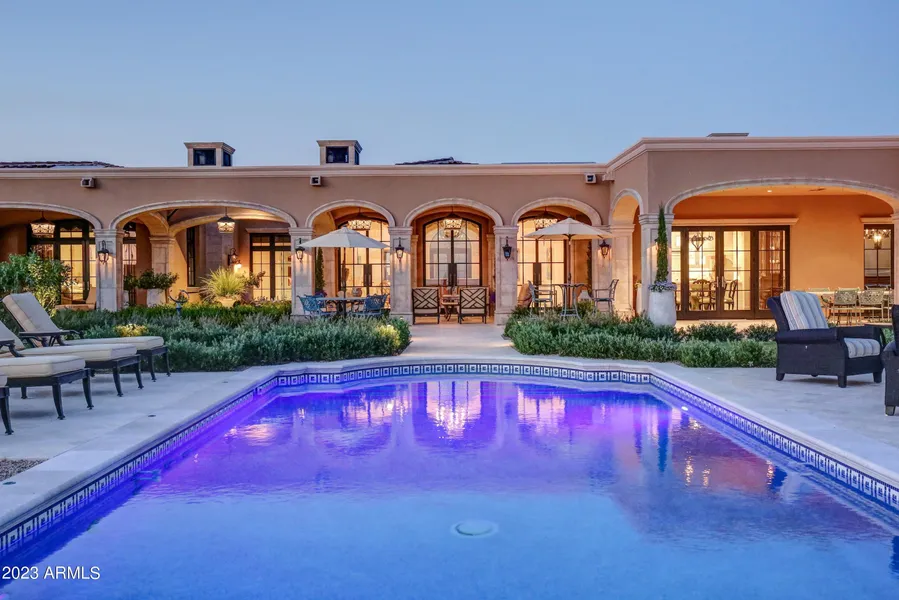 Spectacular Desert Mountain Estate with Golf Membership immediately available. Located in Apache Peak Preserve on 2+ private acres. Nestled among ancient rock formations. Amazing year-round Valley, sunset and city lights views! Ultimate curb appeal with gated porte-cochere and circular auto court. Magnificent gardens encompass colonnaded patios, ramada and spa deck. This single level home is a collaborative effort of 4 ''Masters of the Southwest'' for interior and exterior design, construction and landscape. Expertly curated fixtures, finishes, appliances, and smart home technology. 30-day membership application and approval process. The bridge and gated entry are just the beginning of the dramatic approach, enhanced by. gas lanterns, a bubbling fountain and circular auto court flanked by two garages housing 4 cars total. All leading to the entry courtyard with cozy hearthside seating and seasonal gardens The stunning great room features high ceilings, a deep crown moulding accented with clerestory windows, a grand marble hearth and a bank of European French doors all opening to the colonaded veranda and Valley views. The formal dining room is appointed with built-in, lighted display cabinets and a show-stopping double wine cellar symmetrically flanking the room. A Chef's Kitchen boasts beautiful white cabinetry with lighted displays, a double island, quartzite counters, ideal cooking layout, large pantry and commercial walk-in cooler. Elegant executive library features coffered ceilings and custom built-ins. Finely appointed Primary Bedroom and Spa Bath with marble counters and custom Italian tiles. Family and friends readily gravitate to the roomy yet cozy billiards/media room immediately accessible from the kitchen and patio/pool, complete with mixologist's outfitted serving bar. Guest suites and Casita are spacious and appointed in Chateau-Relais style. The stunning veranda, pool, gazebo and gardens are reminiscent of a Cap Ferret holiday setting, all overlooking unencumbered views of the Valley of the Sun. A generous artist's studio with French windows for natural light is tucked away below the Casita... perfect also as a music studio. It is accessed by an elevator. Separate patio for furry friends is complete with grass, rose garden and a potted kumquat orchard! European-inspired stone fire places are found throughout the exterior courtyards, Great Room, Primary Bedroom and Casita. White oak and marble flooring, European tiles, banks of French doors, impressive mouldings, and elegant fixtures are distinctive features that set this home apart. Smart home features include Savant System and an extensive solar panel array. Plan soon for a private visit of this masterpiece: imagined by the owners in collaboration with Candelaria Design, Manship Builders, Ashley P Design Interiors and Enchanted Gardens. Golf membership available through application to the Club. Purchased from the Club through Escrow. Allow for a 30-day approval process with the Club membership office.