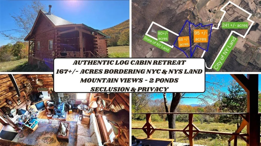 Once-in-a-Lifetime Opportunity - 167+/- Acres with Authentic Log Cabin Bordering 340+ Acres of NYC & NYS Land! Opportunities like this simply don't come along often. This authentic log cabin on approximately 167 acres of pristine Catskill wilderness is a true one-of-a-kind find-a private mountain sanctuary surrounded by nature, seclusion, and endless adventure. Built with craftsmanship rarely seen today, this 1-bedroom, 1-bath cabin features a soaring cathedral ceiling in the great room, a cozy wood stove (plus electric baseboard backup), and a loft that sleeps three and opens to its own balcony overlooking breathtaking mountain views The covered front porch invites you to take in the scenery and the views down to the pond and stretching all the way to Windham Mountain. The crawl space below offers practical storage for ATVs or outdoor gear. The property is nourished by two pure, spring-...