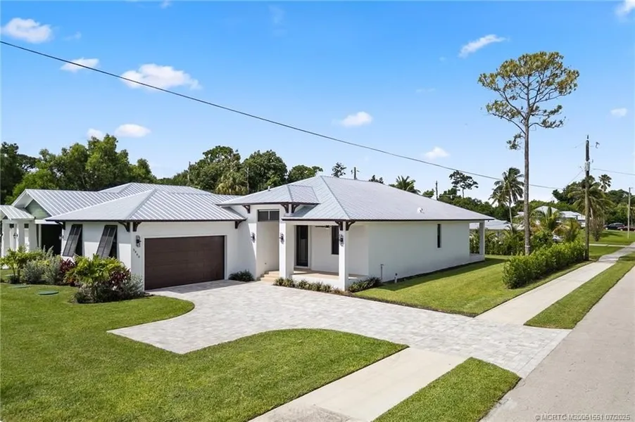 Custom New Construction - This thoughtfully designed 3 bedroom + den, 2.5 bath estate blends charm, quality, and convenience in one beautiful new build. Located just minutes from public boat ramps, Sandsprit Park, and Port Salerno's waterfront dining, this home is the perfect blend of lifestyle and location. Inside, enjoy an open-concept design with quartz countertops, a waterfall eat-in island, wood cabinetry and luxury porcelain tile throughout. Tray ceilings, crown molding, recessed lighting, and ceiling fans add elegance and comfort. Built for peace of mind and longevity with impact windows and doors, a metal roof, and stucco exterior. Relax on the elevated front or back patio with fresh coastal breezes. The oversized 10' garage door and large lot offer space for your boat, RV, or future pool.