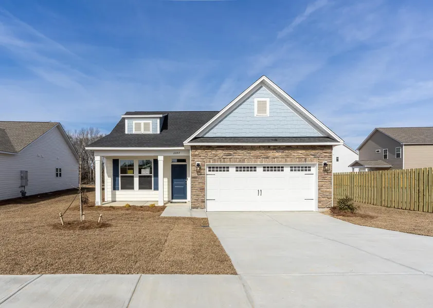 You asked we listened! One of the most common requests in Camellia Park is a floor plan with the primary suite on the main level, and we're excited to introduce The Buck Island II, the perfect blend of ranch and two-story living. Upon entry, you're welcomed by a spacious foyer and a dedicated dining room. The open-concept kitchen features a large quartz island, Bluetooth sound system, and stainless steel appliances, flowing seamlessly into a large family room with access to a covered patio, perfect for indoor/outdoor entertaining. Just off the garage entry, you'll find a powder room and a large laundry room for added convenience. The main-level owner's suite overlooks the backyard and includes a spa-like en suite bath with double quartz vanities, a walk-in shower, garden tub, and an expansive walk-in closet. Upstairs offers two generously sized bedrooms that share a full bath with double sinks, ideal for guests or family. The charming exterior features navy blue accents and stacked stone, adding to this home's standout curb appeal. Stop by for a private showing, our site team is on-site daily! Ask us about our exclusive financing incentives that could get you into this home for less than you think!