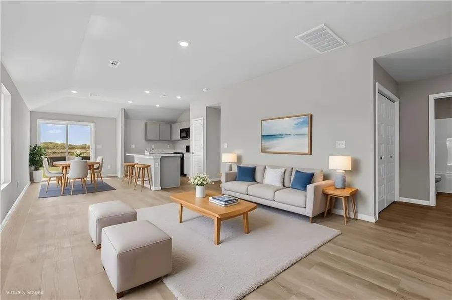 This home is under construction with an anticipated closing date in March/April. Photos are of a finished home in another community. Picture of the color selections are what is going into the home. Open floor plan, with LVP throughout, except bedrooms. Large primary bedroom has a HUGE walk-in closet and 60" walk in shower. 2nd and 3rd bedrooms are at the opposite end of the house. Free standing island with room for at least 3 bar stools and an adjoining dining area with room for a large table. Include the family room seating and you could potentially have up to 15 people seated. The 14x7 patio off the kitchen allows for even more room!
