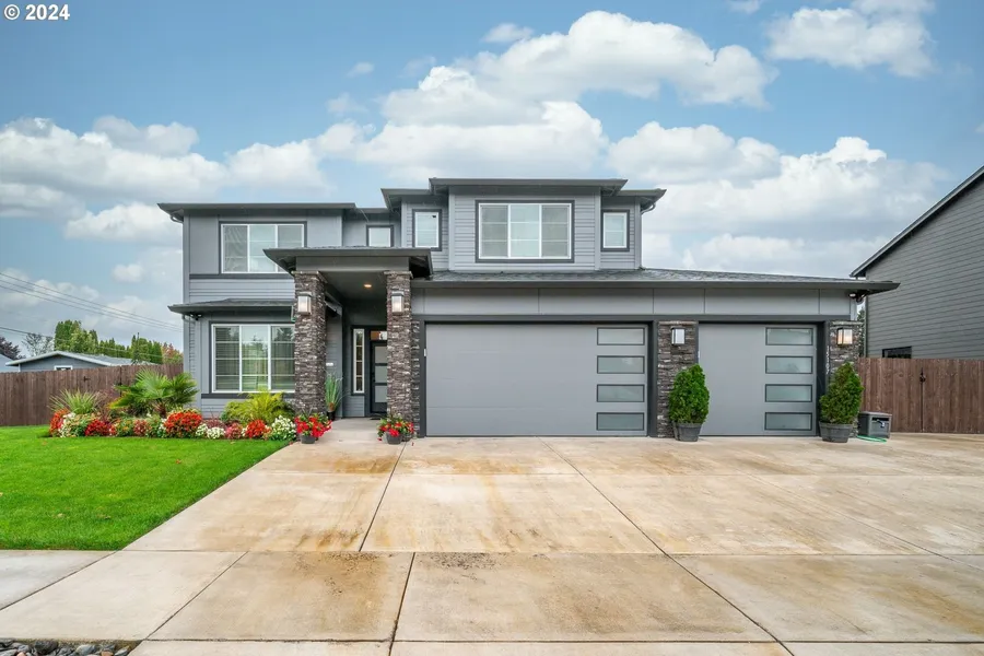 Stunning custom-built two-story home packed with upgrades! This spotless residence features a bright, open great room with soaring windows, a gourmet kitchen with custom cabinetry, slab quartz counters, tile backsplash, stainless steel appliances, and a spacious island. Elegant finishes include hardwood floors, iron-detailed staircase, coffered ceilings, and a stone-accented gas fireplace. The main level offers a guest suite with bath, a private office/den, and 10' ceilings (9' upstairs). The luxurious primary suite boasts dual sinks, soaking tub, walk-in shower, and expansive walk-in closets. Enjoy outdoor living on the covered patio with gas hookup for BBQ, beautifully landscaped fenced yard with sprinkler system, tool shed, and wide driveway. Conveniently located, just minutes to freeways, shopping, parks, and schools. Premium corner lot-this home truly has it all!