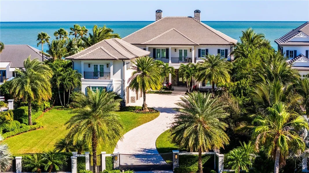 Discover luxury oceanfront living on 1.09 elevated and secluded acres with 104' of beach frontage. Built in 2016, this 5BR/5.4BA coastal estate has dual primary suites, private guest suite, gourmet kitchen, custom office, SAVANT system, custom bar, elevator and laundry rooms on both floors. Effortless outdoor living from breezy terraces, resort-style pool/spa, summer kitchen, putting green, meticulous landscaping, 4 car garage, gated drive and seawall. Near Moorings Yacht Country Club, marina. Miles from public beach access. Partial staging by Vesta Homes-furniture available for purchase.