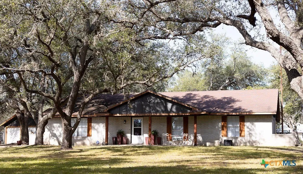 Welcome to this beautifully updated home in the highly sought-after Mission Oaks neighborhood of Mission Valley. Situated on a scenic, oak-covered 1-acre fully fenced lot, this move-in ready property offers the perfect balance of peaceful country living with convenient access to town. Inside, the home features a spacious 3-bedroom, 2-bath layout with a bright, inviting interior and two distinct living areas, ideal for both everyday living and entertaining. The vaulted dining area is filled with natural light and anchored by a cozy wood-burning fireplace, complemented by a grand chandelier that creates a warm and welcoming gathering space. A custom dining table and chairs may convey, if desired. The converted garage adds valuable living space and has been transformed into an entertainment room with new paint, carpet, sliding doors, and an adjacent craft or storage room. The enclosed patio includes a window unit, providing additional flexible space year-round. Outdoors, the property truly shines. The expansive backyard includes a large detached two-car garage/workshop with additional storage and a 50-amp RV hookup, plus an additional outbuilding with electricity, ideal for projects, hobbies, or entertaining. The lot is cross-fenced with gated access, offering privacy and functionality. Recent updates include fully renovated bathrooms, updated kitchen, flooring, paint, and doors, two-year-old kitchen appliances, a whole-house water softener and filtration system, and a water heater installed in 2020. The home is serviced by a private water well and septic system. Located just minutes from the new Mission Valley Elementary School, approximately 15 minutes from Victoria, this property offers space, comfort, and convenience in a well-established neighborhood. Additional furnishings are negotiable.