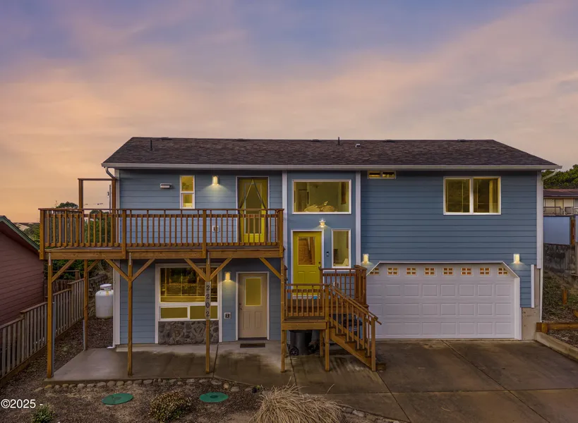 OCEAN VIEWS from this immaculately maintained charmingly decorated home with 3 Bedrooms, 3 Baths, and lower level perfect for guests, multi-generational living, everyday use, private entrance, no-step access with LR, BR, Kit, Bath, W/D hookup). Potential income source as long-term rental (check local zoning). Discover this exquisite home nestled in a wonderful neighborhood. Experience luxurious living, open-concept design that invites natural light to flow through. The spacious kitchen dazzles with granite countertops, while the gorgeous tile work throughout the home adds a touch of elegance and coastal flair, perfect for soaking up the beach living vibe. Distant ocean views from upper deck and kitchen window, forest and mountain views from the deck. This home also features an extra deep 2-car garage with a shop area.