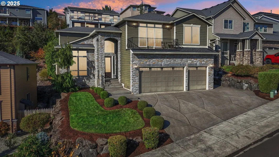STUNNING COLUMBIA RIVER VIEWS! This elegant custom home welcomes you with a covered front porch, leaded glass entry door with sidelites, and clerestory window that fills the soaring entry with natural light. Brazilian hardwood floors with intricate inlays lead to the formal living room where a gas fireplace with a stone surround up to the vaulted ceiling, complemented by a window wall view of the Columbia River. The living room flows seamlessly into the formal dining room, featuring chair rail, crown molding, and convenient access to the gourmet kitchen. The great room offers a family room with travertine-surround gas fireplace, built-ins, some with glass panes, and recessed lighting. The gourmet kitchen includes stainless appliances, granite counters with travertine backsplash, island with breakfast bar, abundant cabinetry some glass panes, separate pantry with frosted glass entry, and heated travertine floors extending to dining area with patio and backyard access. Upstairs, the primary en-suite boasts a private balcony with Columbia River views, walk-in closet with organizer, dual-sink granite vanity, jet tub, tiled shower, walk-in closet, all finished with heated travertine floors. Additional bedrooms include a main-level bedroom/office with built-ins and closet, 3 additional upper-level bedrooms with closets, 1 possible bonus/media room. Bathrooms are thoughtfully designed with pedestal sinks, dual vanities, 1 with heated tile floor. Laundry room & mud room with abundant built-ins add everyday convenience. Interior highlights include exquisite millwork, staircase iron balusters, smart sensor switches, a whole-house fan and fresh air system, heated travertine floors with Wi-Fi thermostat, plumbed for central vacuum system. Enjoy a covered front porch, back patio with gas hookups, landscaped, sprinklers, 3-car garage with overhead storage. Timeless craftsmanship with modern comfort and stunning views. Mortgage savings may be available for buyers of this listing.
