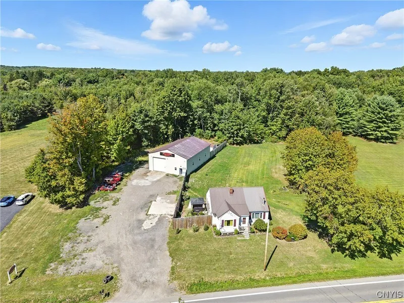 Welcome to 2800 State Route 49! This unique property offers a great opportunity for investors or business owners, located just one mile east of Interstate 81 with excellent commercial exposure. The 2400ft2 steel garage (40'x60') features 16' walls, full insulation, and a modest office with a separate entrance. Inside, you'll find three 10,000lb automotive lifts, an 80-gallon air compressor, a 150,000 BTU waste oil furnace, and a bathroom with its own septic system. There are LED lights, two water spigots, 240v electrical service for welding, and above-office storage. With a large 14'x14' door, it can fit five full-size vehicles. The reinforced 8" concrete floor is designed for heavy-duty use, and additional equipment, including tire mounting gear and hand tools, can be negotiated. Behind an 8' privacy fence sits a +/-1400ft2 1950s Aladdin Cape Cod home. Aladdin homes were built with pre-cut, labeled timber and adaptable designs. The home could be used for rental income or as a primary residence. A new 8'x8' Hydrotherapy Spa is nearby. The full basement has concrete floors, a watertight drainage system, a high-efficiency sump pump, a newer gas furnace, and ample storage. The renovated kitchen features new cabinets, countertops, and appliances in a spacious 14'x17' layout ideal for entertaining. The 20'x14' living room includes a rice coal stove for extra heat and charm. Hardwood floors run through the living room and first-floor bedrooms, each about 10'x12' with large closets. A renovated full bathroom provides more space than the original design. Upstairs, the 35'x13' master suite boasts new laminate flooring, textured walls, and plenty of storage. Large windows offer beautiful views of the sunrise and sunset. The property spans 6.6 acres of landscaped field and wooded land, with mature trees ideal for lumber or firewood. About 1/3 of the land is cleared, and 2/3 is wooded, offering flexibility for commercial or personal use. Located in the growing community of West Monroe, just 20 minutes from Syracuse, this property is convenient to I-81, restaurants, shopping, medical services, and outdoor recreation. Call today to schedule a viewing!