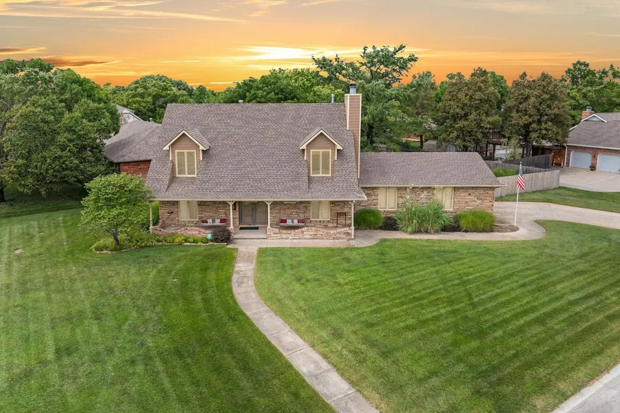 Welcome home to this 4 bed, 2.5 bath corner-lot property in East Wichita, complete with an oversized sideload garage and a sparkling 16x32 inground pool. The exterior blends stone accents, a covered front porch with dual swings, and lush landscaping for standout curb appeal. Inside, the sunken living room is anchored by a floor-to-ceiling stone fireplace and built-in wet bar-perfect for relaxing or entertaining. The kitchen features updated LVP flooring, stone-style counters, a tile backsplash, breakfast bar, and a bay-window nook overlooking the backyard. A flexible front room works equally well as formal dining, office, or lounge space. Main-floor laundry, pantry storage, and a guest half bath add convenience. Upstairs, the spacious primary suite offers a walk-in closet, dual vanity, updated fixtures, and a shower/tub combo. Three additional bedrooms provide plenty of space-one with a walk-in closet, another with a smart dual-layout design-plus a full hall bath. The finished basement expands your living area with a large rec room (pool table included!) and a dedicated storage room. Outside, the fenced backyard features a sparkling inground pool with a brand-new liner, rebuilt stairs, and auto chlorinator-all updates completed this summer that make the pool feel like new and ready for years of enjoyment. Extras include the oversized 2-car sideload garage with epoxy floors, zoned HVAC systems less than 10 years old, an attic fan, and an underground sprinkler system on an irrigation well. Conveniently located near highways, shopping, dining, parks, and schools, this home blends comfort, function, and fun. Schedule your private showing today!