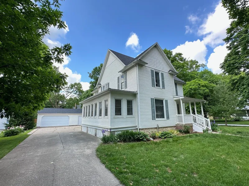 Prepare to be impressed with the renovations done to bring this stately home back to it's orignal glory! Step up to the inviting front covered porch & through the original leaded glass door into the stunning entryway showcasing the gorgeous stairway & original woodwork. The orignal hardwood floors flow throughout the entry room, HUGE living room, and into the formal dining room. Off the living room is a 4 season porch with tons of east facing windows perfect for morning coffee. The kitchen is very large with tons of cabinets, new backsplash, & quartz countertops. There is a 1/2 bath off the kitchen as well as a nice sized mud/laundry room. Upstairs you will love the open loft area that would be a great office area or reading nook. There is a primary bedroom with its own 3/4 bath, 2 additional bedrooms & updated full bath. Outside you will enjoy the abundance of parking in the large driveway, the oversized 2 car garage and spacious corner lot. Updates include roof 2020, Furnace 2022, Plumbing 2017, electrical 2018 was well as paint, woodwork refinishing and an attic renovation. Schedule a time to view this historic beauty in person! Seller is offering $6000 carpet allowance to the buyer!