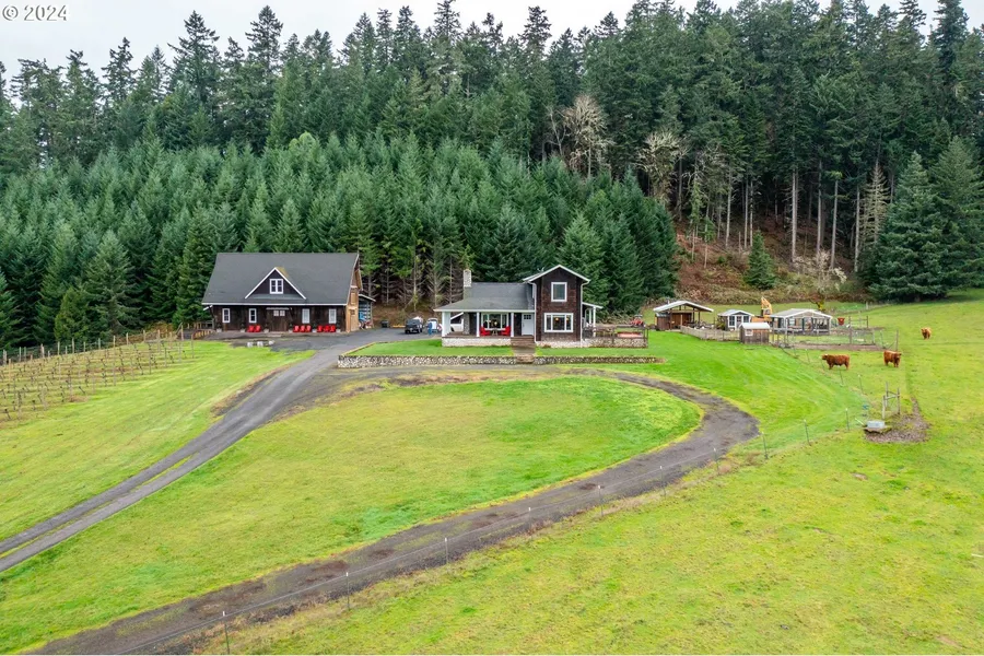 Welcome to the epitome of Oregon living! Nestled amongst the trees and valleys you will experience privacy and seclusion on your very own 100 acres complete with vineyard, pasture, and timberland. This one-of-a kind property is completely off-grid with a 5KW solar system, 13.5KW Kuboda diesel back-up generator, 2 private wells, 2500-gallon gravity feed water storage system, 1000-gallon diesel tank, and 500-gallon propane tank. The custom 2000+ sqft farmhouse was built in 2000 with modern conveniences and old-world charm including wrap around porch, open beam ceilings, wood floors, masonry fireplace, formal dining, 36" gas range, mud room, gas stove, custom built-ins, insulated 4-car garage, back deck with hot tub, and more! Utilize the 10 acres of Pinot Noir grapes with your very own tasting & barrel room. The 3600 sqft building offers an inviting tasting space with wood stove, a barrel ...