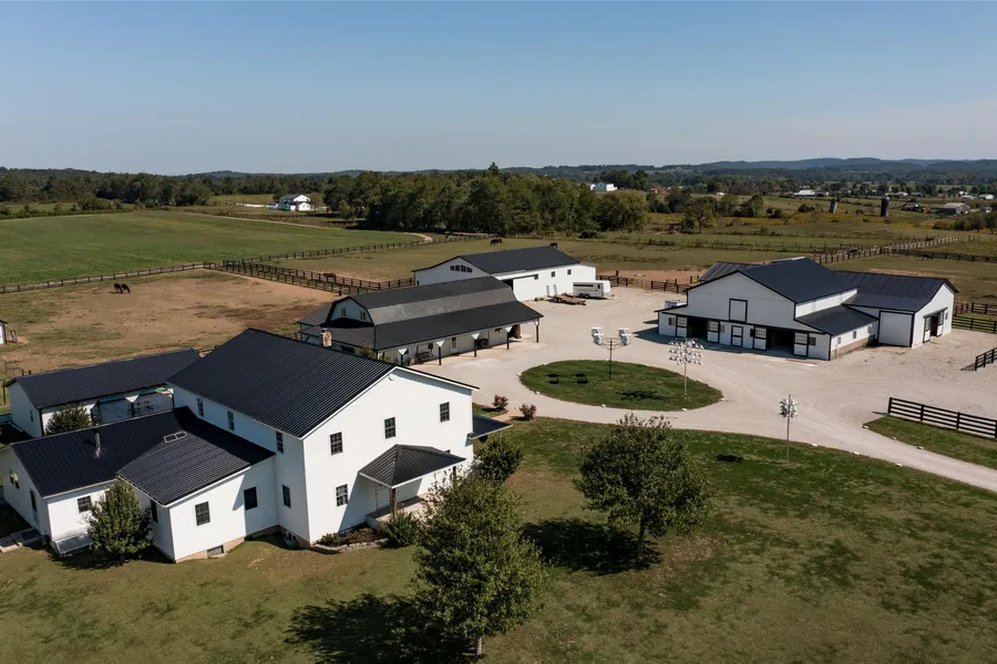 Welcome to a rare and remarkable property that combines country luxury, equestrian excellence, and business potential all in one stunning package. Situated on 41.35 fully fenced acres, this beautiful horse farm offers everything you need for refined country living, serious horse training, or a multi-family living opportunity. The land features seven paddocks/lots and a large field with a training track around the perimeter, along with the ability to grow your own hay, a self-sustaining setup designed for equine enthusiasts. A spring-fed pond stocked with largemouth bass adds to the charm and functionality of this exceptional estate. The home is a classic two-story farmhouse boasting over 4,700 square feet of finished living space plus a poured concrete partial basement. Wraparound porches frame breathtaking views of rolling hills, perfect for taking in both sunrise and sunset. Additional property highlights include a barndominium with guest quarters, horse stables, a multi-purpose barn, a dedicated business building, and a pavilion designed for entertaining, all fully integrated for either private use or a turnkey business operation. With its panoramic vistas, premium facilities, and unmatched versatility, this property is truly a dream come true for horse lovers, entrepreneurs, and families alike. Whether you're looking to run a horse or agricultural business, create a private retreat, or live off the grid, this farm delivers limitless opportunity. Experience a lifestyle where beauty, productivity, and opportunity meet. This is more than a farm, it's a legacy waiting to be continued.