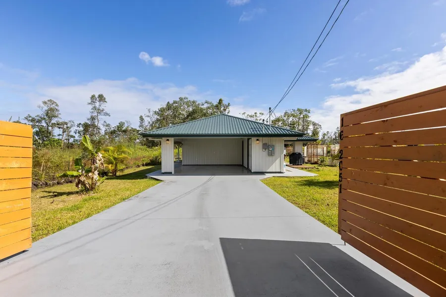 This newly constructed residential home was finalized on December 11, 2023. This 3-bedroom, 2-bathroom property features a kitchen with beautiful quartz counter-tops and a high-quality gas range and oven. The dining area leads into a living room with vaulted ceilings. Additional interior features include a laundry room with a sink, a 2-car carport, storage space, and double-pane vinyl windows. The exterior offers a large covered patio and is situated on a paved road with easy highway access. The location is approximately 25 minutes from Hilo and 10 minutes from Pahoa or Keaau. The home includes a 10,000-gallon water storage tank equipped with a UV lightbar and two-stage string filters. The propane system is set up for two tanks with an automatic switch-over feature. This brand-new construction is easy to show.