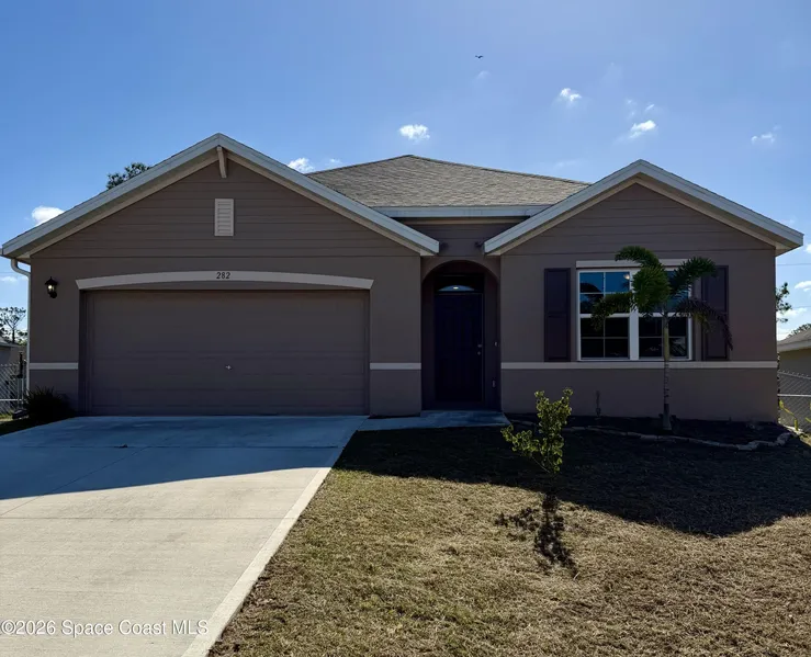 Located in a highly sought-after area of Palm Bay, Florida, this beautiful new construction home truly has it all. Featuring four spacious bedrooms, tile flooring throughout, and an indoor laundry room, the home offers a bright and open floor plan designed for comfortable Florida living. The kitchen is a standout with rich dark cabinetry, light countertops, and seamless flow into the main living area-perfect for entertaining or everyday life. Situated on a high and dry lot, the fully fenced backyard provides an incredibly private setting and showcases a stunning lagoon-shaped in-ground pool, ideal for enjoying Florida summers. Pool service is included, and the washer and dryer convey, making this home truly move-in ready. The primary suite offers a peaceful retreat with a double sink vanity and walk-in shower, while all bedrooms throughout the home are generously sized. Don't miss your o...