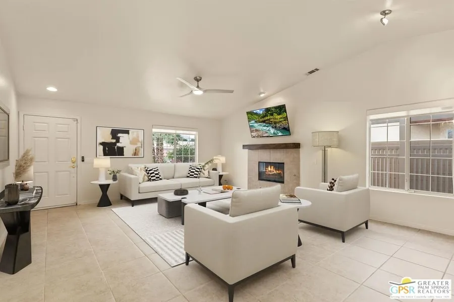 Refreshed! Revitalized! Ready for move in and your personal touch. Nestled in the South End of Palm Springs, this three-bedroom, two-bath, energy efficient home with 21 owned solar panels combines desert tranquility with convenience and economy. Located in a secluded neighborhood, yet less than 1.5 miles from shopping and restaurants, it offers a peaceful retreat that remains closely connected to the life of the city. Inside, an open floor plan filled with natural light creates a welcoming atmosphere. The living room, with its fireplace, flows into a kitchen featuring granite countertops, ample work space, and modern appliances. A versatile dining area, accented by a striking chandelier-style light fixture, can easily shift from casual meals to more formal gatherings. The larger-than-average for this size home 21-panel solar system reduces and eliminates electrical bills especially during the hot summer months. The primary bedroom, two additional bedrooms (one for guests and one for an office), ceiling fans throughout, a dedicated laundry area, and double car garage, add to the home's comfort and functionality. Out back, a private yard with a pebble tech pool and spa offer a personal resort experience just steps from the door. Mature landscaping and citrus trees form a calm, secluded oasis. A covered patio invites outdoor dining and entertaining. Recreation is close at hand: Tahquitz Creek Golf Course and its driving range, city pickleball courts, the CV Link walking and biking path, and numerous hiking trails are all nearby. Together, these features make this home an appealing choice for anyone seeking a comfortable, efficient and economical home that fully embraces the Palm Springs lifestyle. Furnishings shown are digitally generated and not in the home.