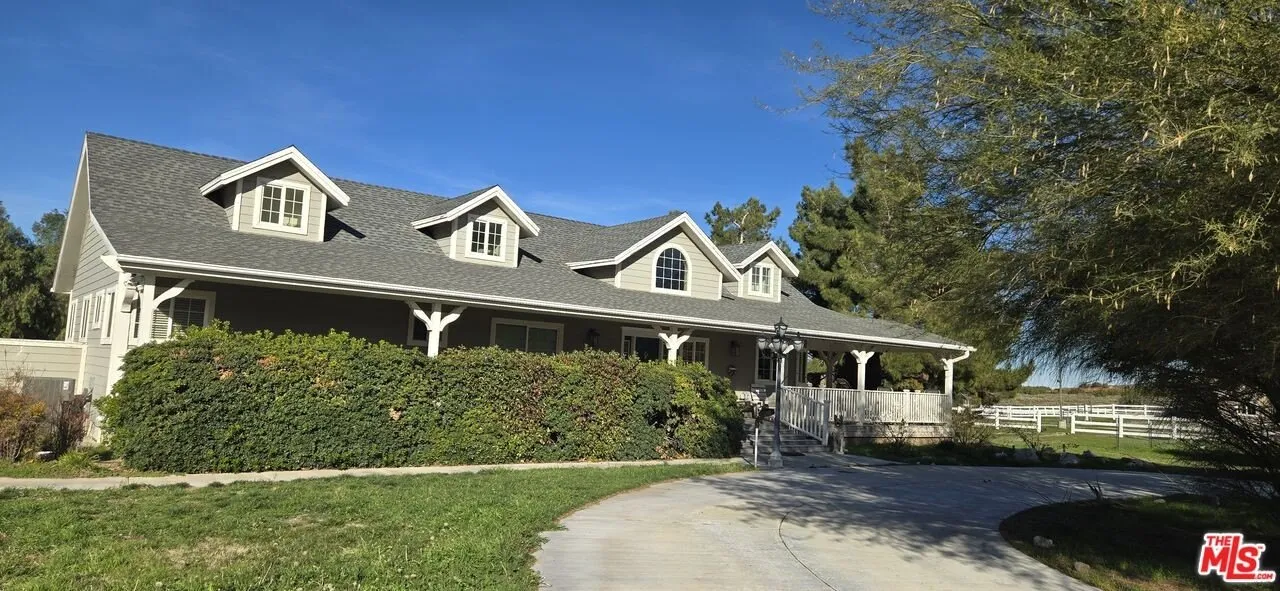 Exceptional equestrian horse ranch offering privacy, functionality, and resort-style living. Custom-built in 2004 with fire-resistant fiber-cement siding, 2x6 construction, and composite porches. Light-filled open floor plan connects kitchen, dining, den, and living areas-ideal for entertaining. Living and dining room feature built-ins, fireplace with heat-circulating fan, built-in speakers, and French doors opening to expansive outdoor living. Chef's kitchen includes granite countertops, solid oak cabinetry, GE Profile stainless appliances, double ovens, dual sinks, wine storage, and generous prep space. Spacious primary suite with cathedral ceilings, surround sound, spa-style bath, and direct access to rear porch and spa. Finished basement offers second kitchen, wine cellar, office, entertaining areas, two bedrooms, and steam room. Oversized 3-car garage with EV charger. Designed for serious equestrian use, the property features a 13-stall Castlebrook barn, fully enclosed and lighted arena, round pen, hot walker (horse exerciser), wash rack, multiple turnouts, RV hookups, workshop, and support buildings. Resort-style backyard includes saltwater pool and spa with waterfall, Viking outdoor kitchen, covered patios, and automated gated entry. Energy-efficient amenities include solar, private well, water storage, RO filtration, tankless water heater, and heat pump. Approx. 200 pistachio trees, 150 fruit trees, and sweeping mountain and desert views complete this rare horse property.