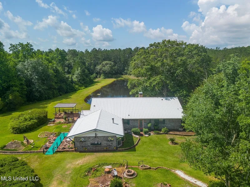 As you travel down the private, winding driveway through towering hardwoods and mature foliage, you arrive at your peaceful retreat-a 2,511 SqFt, 3-bedroom, 3-bath home perfectly positioned on 43 secluded acres. With elevations reaching up to 150 feet above sea level, the home overlooks a tranquil private lake, offering scenic views and ultimate privacy. Inside, the tile foyer leads you into a spacious kitchen that opens to the living area, anchored by a striking two-sided stone fireplace. The split floor plan provides three bedrooms and three baths (two full and one three-quarter), offering both comfort and flexibility. The primary suite is a true retreat, featuring bay windows, a wet bar, and your very own wood-burning stove. Additional features include retractable storm shutters, a laundry room with mop sink, and thoughtfully designed storage throughout. Outdoors, enjoy multiple spaces for relaxation and entertaining including: 21' x 18' covered patio with metal handrails overlooking the lake,, a 10' x 20' front covered patio, and a 20' x 25' rear deck with serene water views. For hobbyists or additional storage, the 20' x 20' workshop includes a 10-foot garage door, built-in workbench, metal roof, and full utilities (power & water). Whether you're seeking a private homestead, recreational escape, or future investment, this unique property offers it all-peace, privacy, and the charm of lakefront living. All just 15 minutes to the new Buc-ees and Interstate 10. Buyer and their agent to verify all.