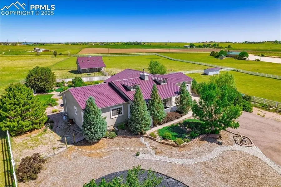 Multi-generational House - No HOA * 5.5 acres w/ separate apartment, and barn/workshop. Central AC. Close to Hwy 24, Woodmen, Meridian, Constitution, Peterson & Schriever 7 miles to new Falcon King Soopers. This custom home is a must see for all the family, whether you need a mother-in-law apt or a separate level for your adult children. It features a full 1 bedrm aptmt with kitchen, dining, laundry and living rooms with separate ramped entry & private deck. This ranch can accommodate everyone, including your horses, chickens & dogs. Another separate entry gives access to a basement apt with family rm, kitchenette & 2 bd/1 full bath. The main house features an XL island in a huge kitchen, w/ a pantry, cabinets galore & laundry hookups. Dine together in the 3 season sunroom w/ views of Pikes Peak or by the see-thru fireplace in the formal dining room. This ranch includes a lg master suite w/ 5 pc bath, 2 additional bedrms & another full bath. There is unbelievable storage throughout this property: 4 walk-in closets, 2 coat closets, pantry x2, a lg under apt walkable crawl space, 2 basement storage rooms, an oversized 3-car garage w/ shelves, an enclosed loafing shed and a 36x36 barn w/ loft & office. The property is completely fenced & x-fenced w/ 4-rail white vinyl, and divided into 3 gated pastures. The 2-story barn has electricity, water and a drive-thru feature. There are also fenced areas for vegetable gardening and a fenced play area close to the house for small children, pets or chickens. Mature landscaping abounds with trees, blooming bushes and flower beds galore, which are mulched for low maintenance and dripped by a domestic well. The brick patio and meandering pathways lead to many areas to entertain, play and enjoy the unobstructed views of Pikes Peak. Privacy and quiet are enhanced by the 40 acre ranch to the west and the 5 acre open church property to the east. So bring the whole family, horses and dogs to enjoy quiet country living at its best!