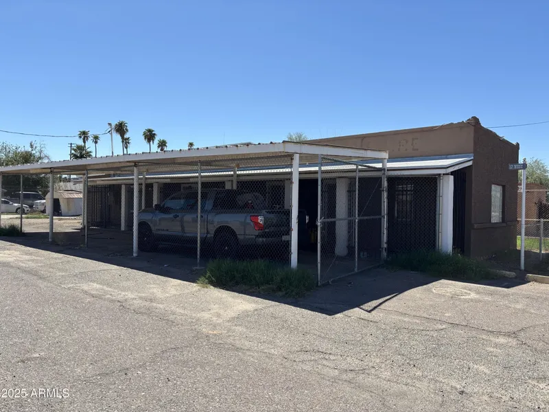 Functional single-story building features three large versatile rooms with connecting interior doors that may accommodate office space, light commercial enterprise or storage. Two bathrooms and a second hallway exit are situated along south side of building. Owner added new septic and water lines, water heater, roof, electrical lines and split AC systems. Covered parking area may accommodate at least three vehicles, and the entire property is encompassed by chain-link and barbed wire fencing as well as tubular steel fencing and gate along the patio exterior. There is also a spacious exterior yard south of the building perfect for expansion. Conveniently located just west of Central Avenue along the light rail route!