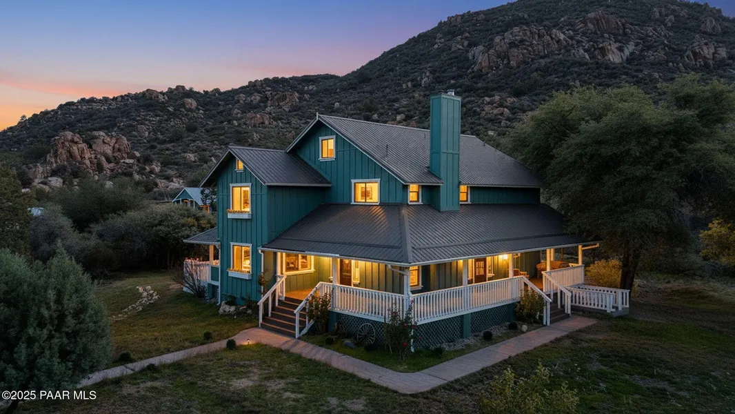 Bordering Prescott National Forest, this 6 acre ranch style retreat pairs big sky views of boulders and mountains with true self reliance (Additional contiguous acreage is available)This ~3,600 SF, 5BD/4BA residence welcomes with a bright white kitchen featuring a gas range with pot filler, stainless appliances, abundant cabinetry and an eat in bar that opens to living and dining anchored by a cozy wood burning fireplace. The upstairs master suite is a sanctuary with sitting area and gas fireplace, private deck, spa bath with walk-in rain shower, and an expansive walk-in closet. Flexible spaces include loft, family room, mud room and dedicated laundry. Outdoor living shines: wrap around porch, massive pergola, fire pit terrace and sweeping vistas framed by manzanita, rock outcroppings and mature pines and oaks plus black walnut and fruit trees. Outbuildings and features include a worksho...