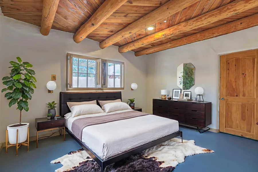 One-of-kind property in a one-of-kind location! This Watson adobe home is steps away from Tiguex Park, Old town, museums, the Abq Bio Park, shops and eateries. Incredible, walkable location on a private, tree-lined street. The home itself has been beautifully updated and lovingly maintained, while keeping it's old-world charm. Y'all will love the hardwood floors, tongue-in groove ceilings with large viga timbers, and the woodburning kiva fireplace. The open, eat-in kitchen boasts modern amenities such as stainless-steel appliances, and granite countertops. The screened in porch, covered patio and heated and cooled outbuilding provide additional flex spaces. If you want a home with authentic New Mexican character, this is the one you have been waiting for!