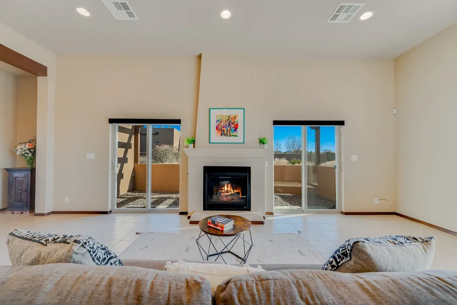This thoughtfully designed three-bedroom, two-bathroom home offers space, comfort, and elegance in a peaceful neighborhood that is both easy to live in and commute from. The single-level home spans 2,256 square feet and includes a 331-square-foot attached studio (the converted third garage bay)-ideal as a fourth bedroom, office, or creative space. A bright living room with a cozy fireplace invites relaxation, while the modern kitchen features stainless steel appliances, stone counters, and ample space for cooking and entertaining. High ceilings, recessed lighting, and tile flooring enhance the open layout. The primary bedroom is complemented by an en-suite bathroom with double vanities, soaking tub with separate shower, and a generous walk-in closet. Two additional bedrooms provide flexibility for family or remote work. Located in the back of the development with views of green space and close to walking trails, your private outdoor space will feel limitless. Mature landscaping, the covered back portal and large side pergola combine to offer space for gatherings, gardening, or quiet moments. Other features include an attached 2-car garage, central AC and heat, and a roof with transferable warranty. Located near the Dinosaur Trail Trailhead and close to local supermarkets and healthcare, this home combines practical living with Santa Fe charm.