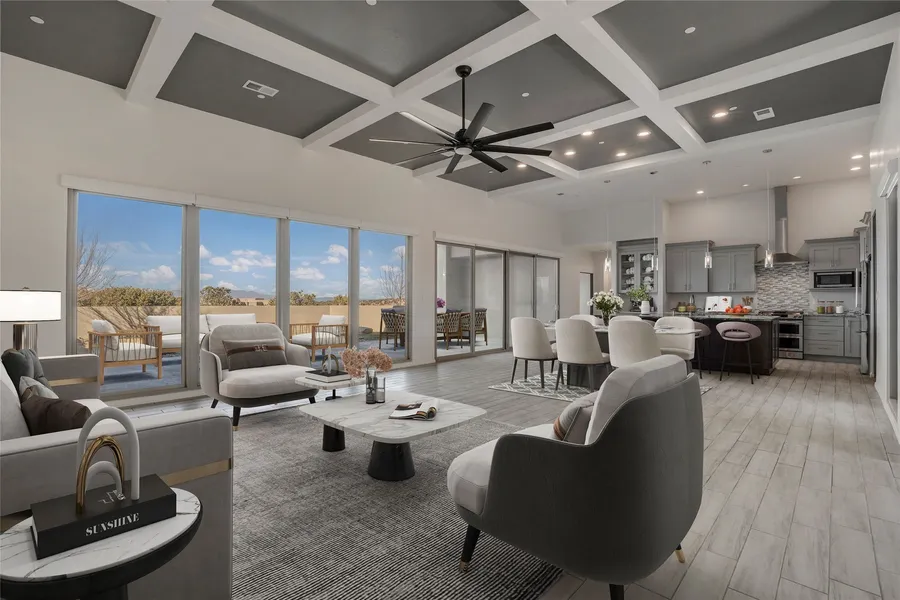 Set against the timeless landscape of northern New Mexico and beautiful views of the Jemez and Sangre de Cristo Mountains, this inviting home on 2.4 acres blends classic Santa Fe style with comfortable modern living. Enjoying a private but convenient setting in the desirable Sundance Ridge subdivision off of Tano Road, this home consists of just under 2,400 sq. ft. of living space, configured as 3 bedrooms and 2.5 baths. The 5-year old home has a wonderfully open floor plan for the main living spaces and offers excellent separation between the guest bedrooms and primary suite. A wall of windows on the west side of the home looks out to the ample back patio, walled garden and lawn for unparallelled indoor/outdoor living. Enjoy the serene surroundings, big sunset views and dark night skies! All of this less than 15 minutes to the nearest grocery store, and less than 20 minutes to the Santa...